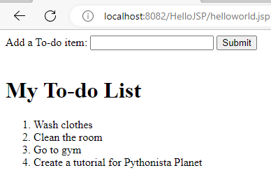Let’s create a To-do list application to demonstrate the concept of sessions. This app lets the user add items to the to-do list. The to-do list items will be stored in the user’s session object. Each user will have their own to-do list.