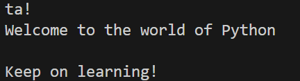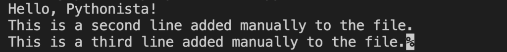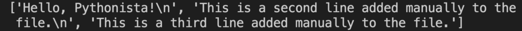 lines = ["Hello, Pythonista!\n", "Welcome to the world of Python.\n"]