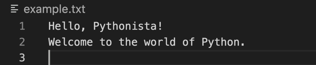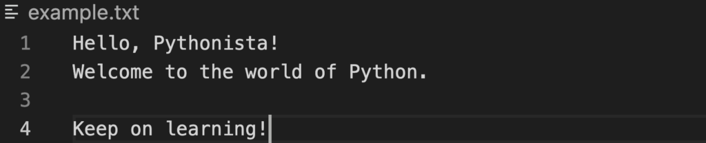 Let’s create a file called “example.txt” with some text in it. Save the file in the same folder as that of the Python file. We will try to read this text file using Python.